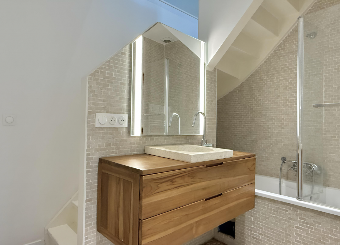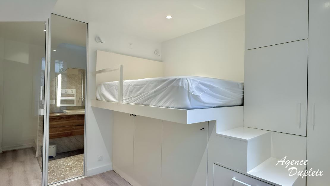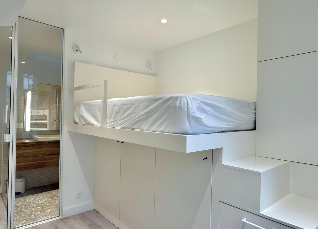 - au rez de chaussée : une chambre avec rangements, une salle de bains
