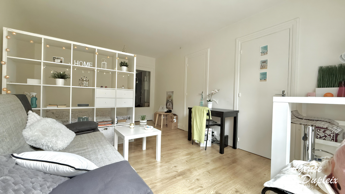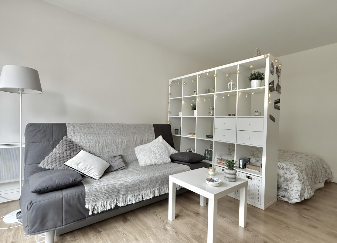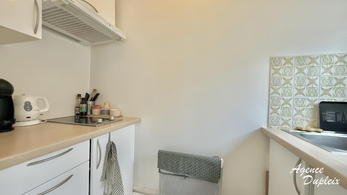 Un grand studio au 1er étage avec ascenseur se composant d'une entrée, une pièce principale avec un dressing et une terrasse, une cuisine séparée aménagée et équipée de plaques de cuisson, d'un four, d'une hotte et d'un réfrigérateur, une salle de bains avec WC et un lave linge.