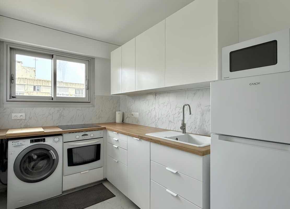 Un appartement entièrement repeint au 6 ème étage avec ascenseur comprenant une entrée, un séjour ouvrant sur un large balcon, une cuisine séparée refaite à neuf, aménagée et équipée d'un four, plaques de cuisson, lave vaisselle, lave linge, réfrigérateur- congélateur et micro ondes, un dégagement avec placards, une chambre donnant également accès au balcon, une salle de bains et des WC séparés. Une cave complète ce bien.