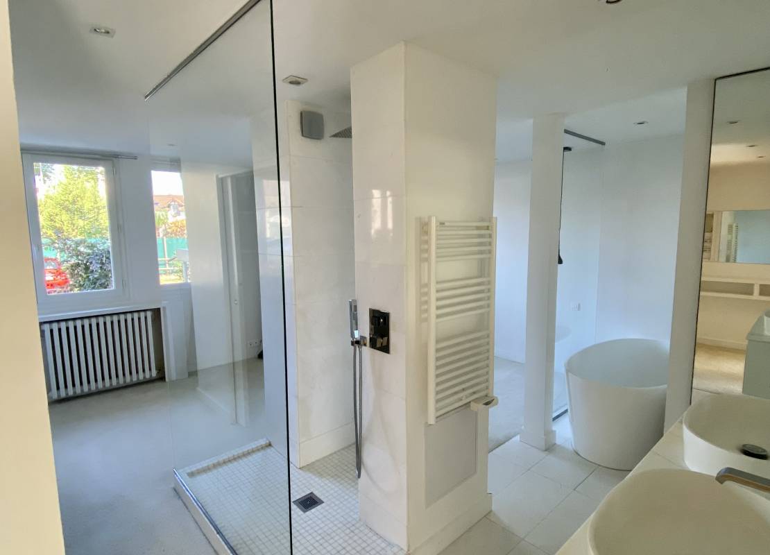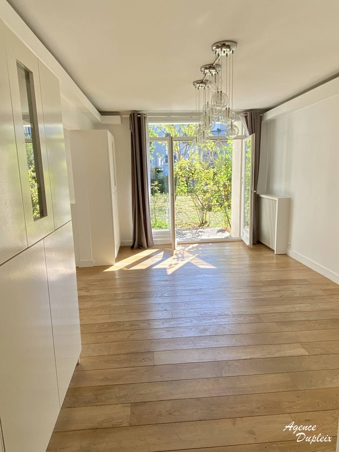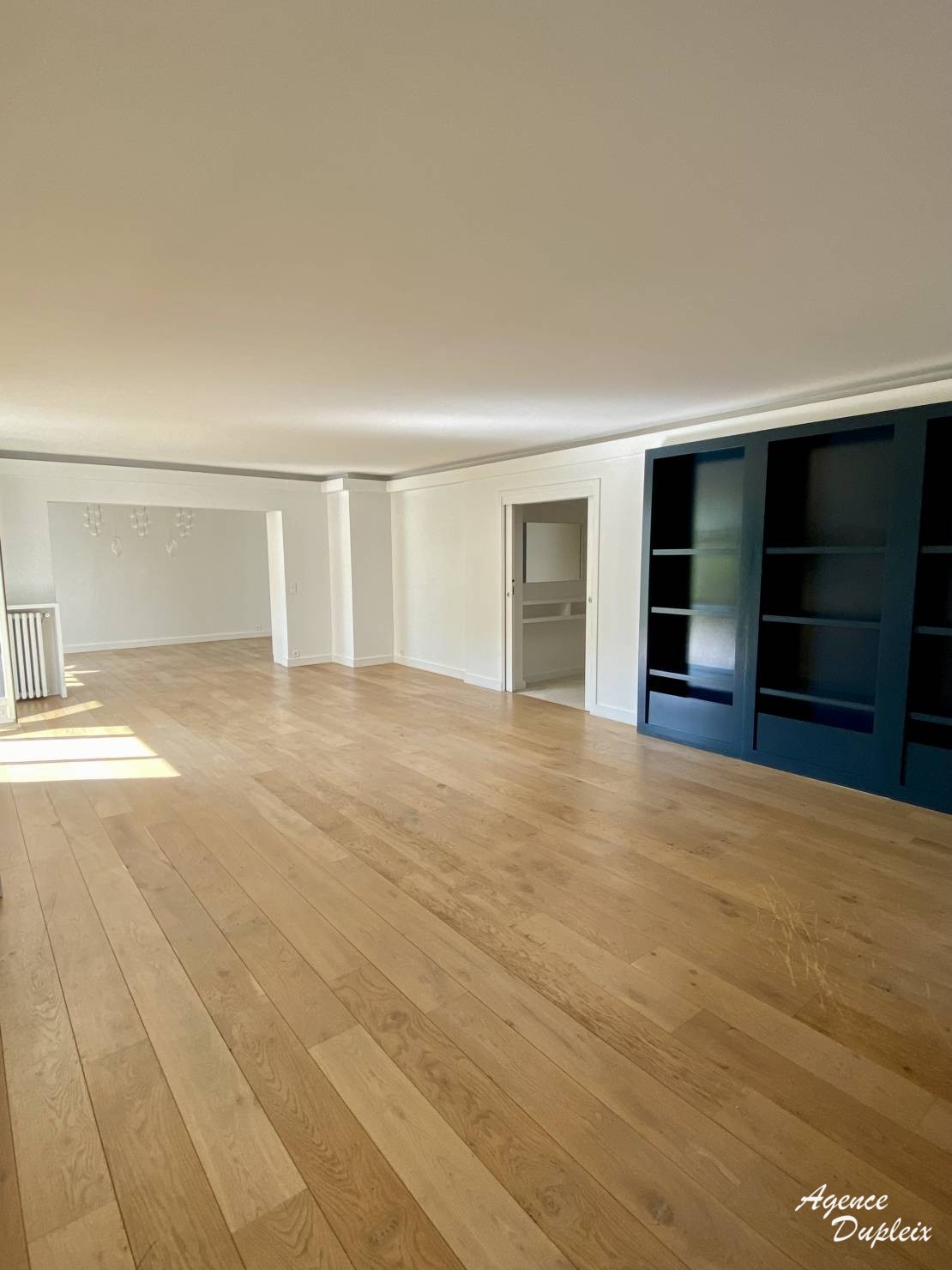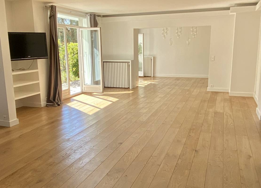 Parc de Maisons Laffitte, en rez de chaussée avec terrasse, un superbe appartement de type 6 pièces se composant d'une entrée, une cuisine ouverte aménagée et équipée de plaques de cuisson, hotte, four, frigo-congélateur, lave vaisselle, une machine à laver et un sèche linge, 2 chambres avec rangements, une salle d'eau à l'italienne avec WC, une salle à manger, un double séjour de 45m2 avec une cheminée à l'étahnol, une magnifique suite parentale avec une douche, une baignoire, un dressing ainsi que des WC.