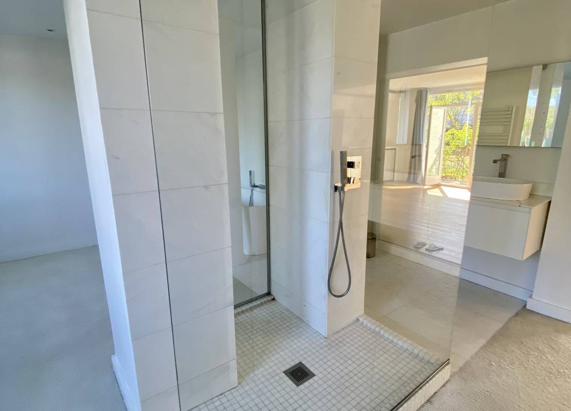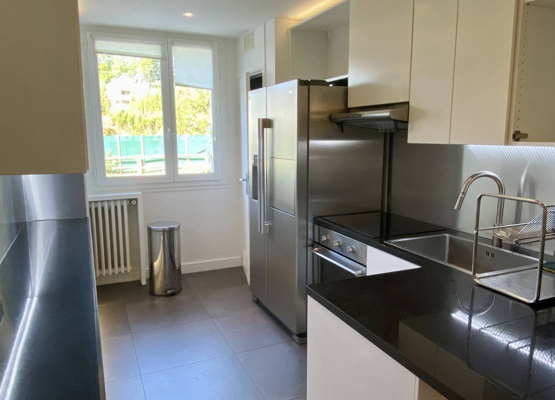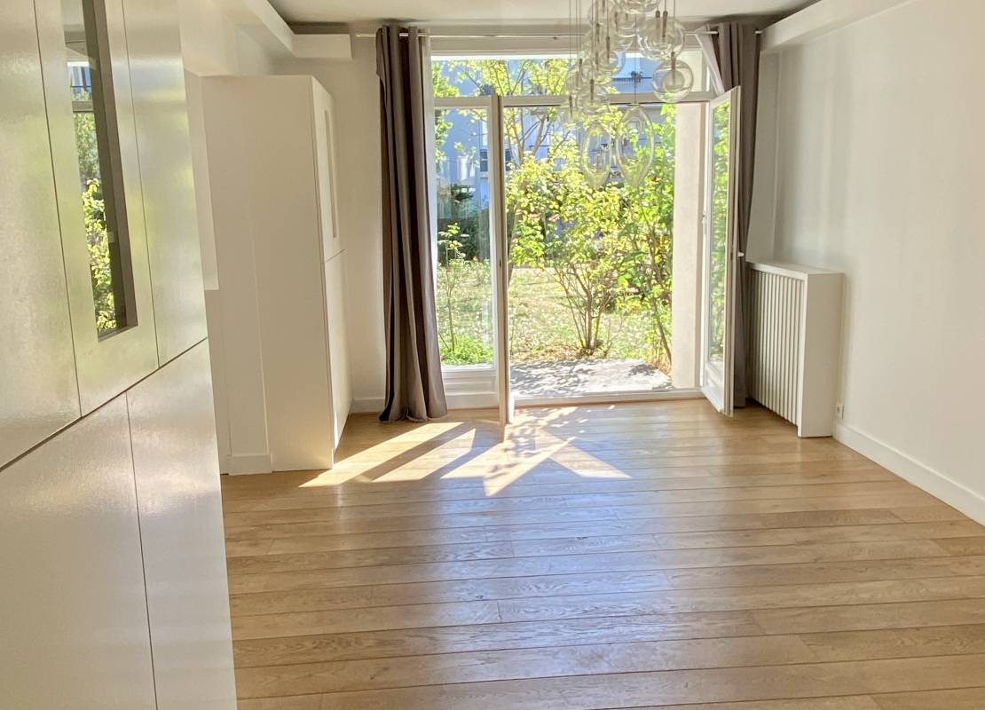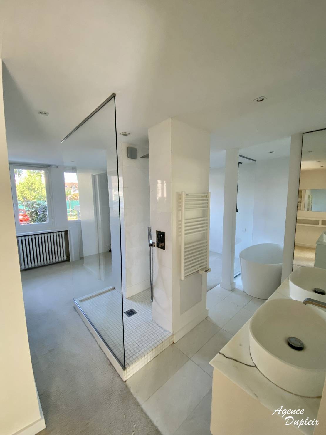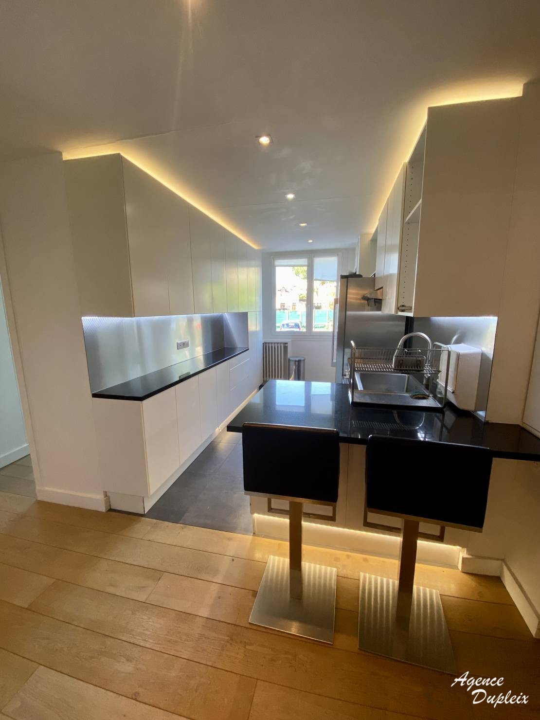 Parc de Maisons Laffitte, en rez de chaussée avec terrasse, un superbe appartement de type 6 pièces se composant d'une entrée, une cuisine ouverte aménagée et équipée de plaques de cuisson, hotte, four, frigo-congélateur, lave vaisselle, une machine à laver et un sèche linge, 2 chambres avec rangements, une salle d'eau à l'italienne avec WC, une salle à manger, un double séjour de 45m2 avec une cheminée à l'étahnol, une magnifique suite parentale avec une douche, une baignoire, un dressing ainsi que des WC.