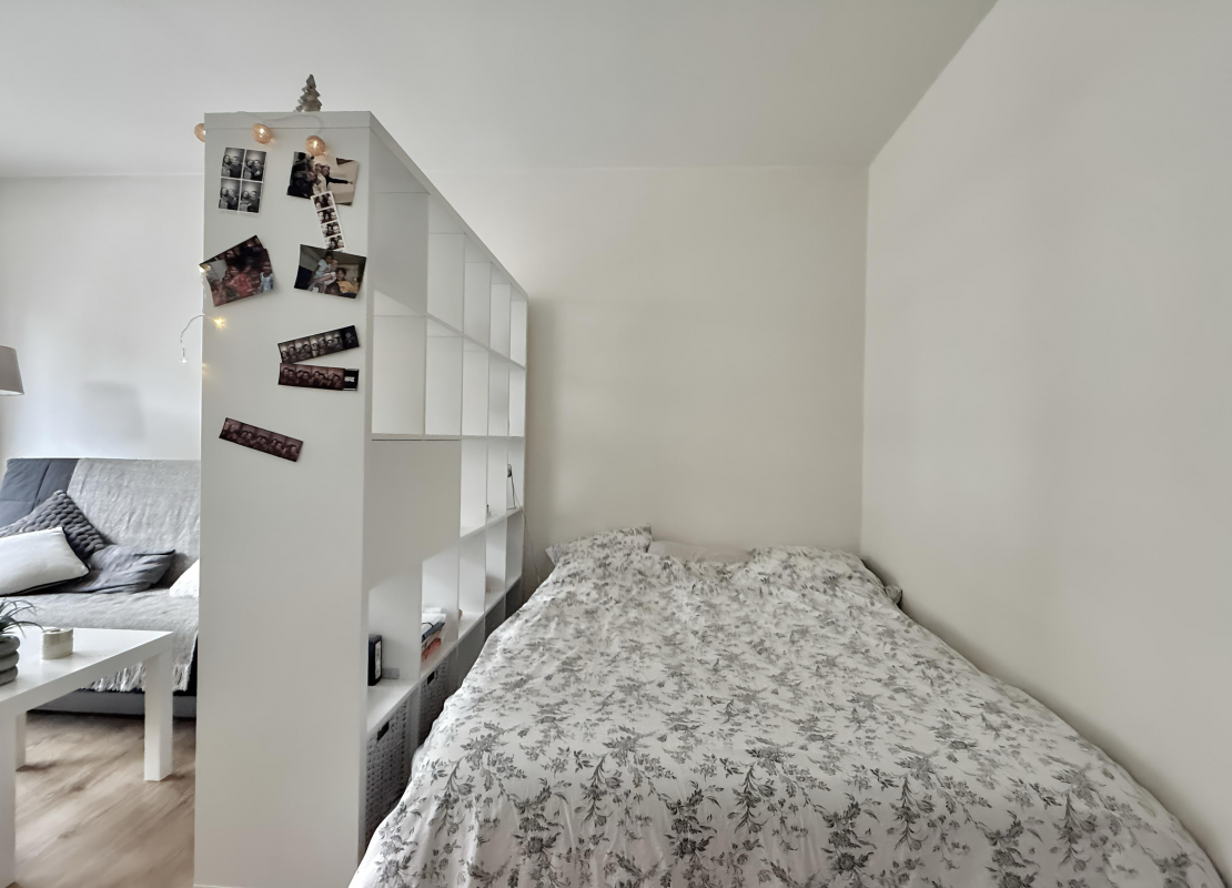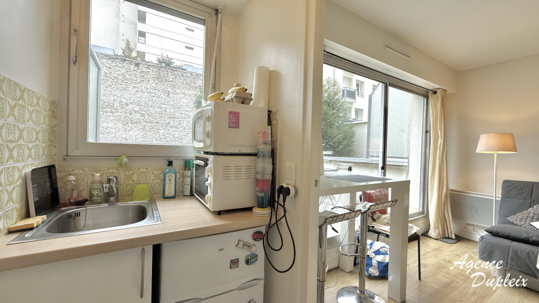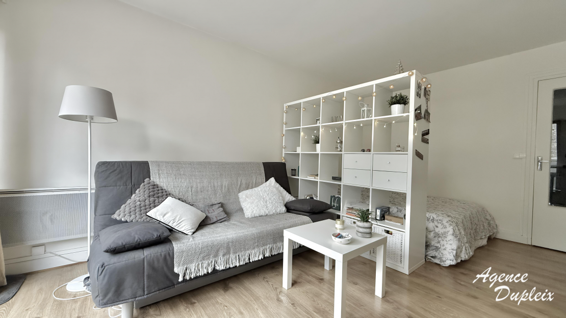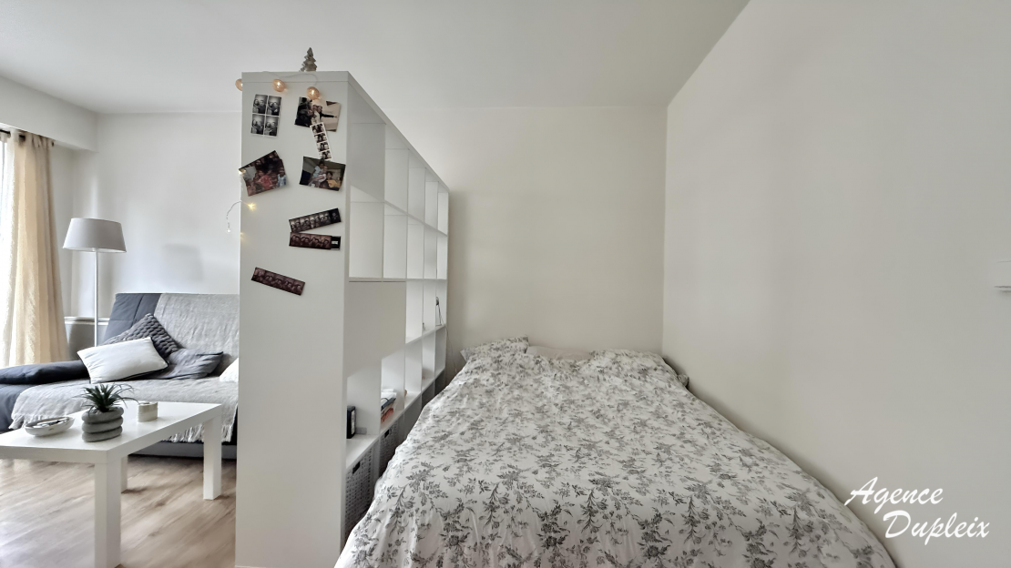 Un grand studio au 1er étage avec ascenseur se composant d'une entrée, une pièce principale avec un dressing et une terrasse, une cuisine séparée aménagée et équipée de plaques de cuisson, d'un four, d'une hotte et d'un réfrigérateur, une salle de bains avec WC et un lave linge.