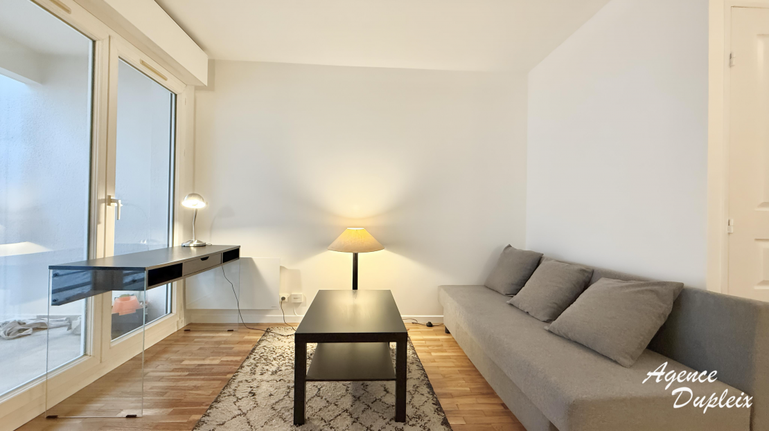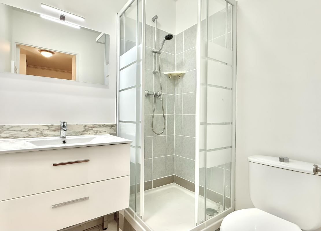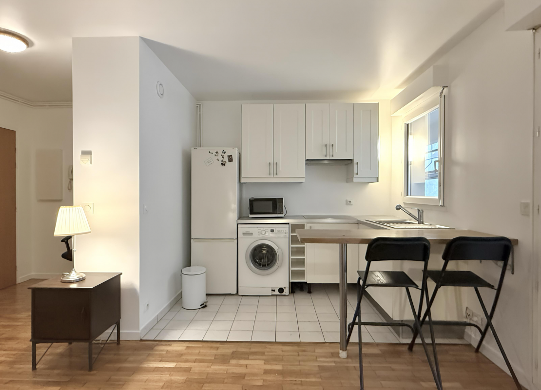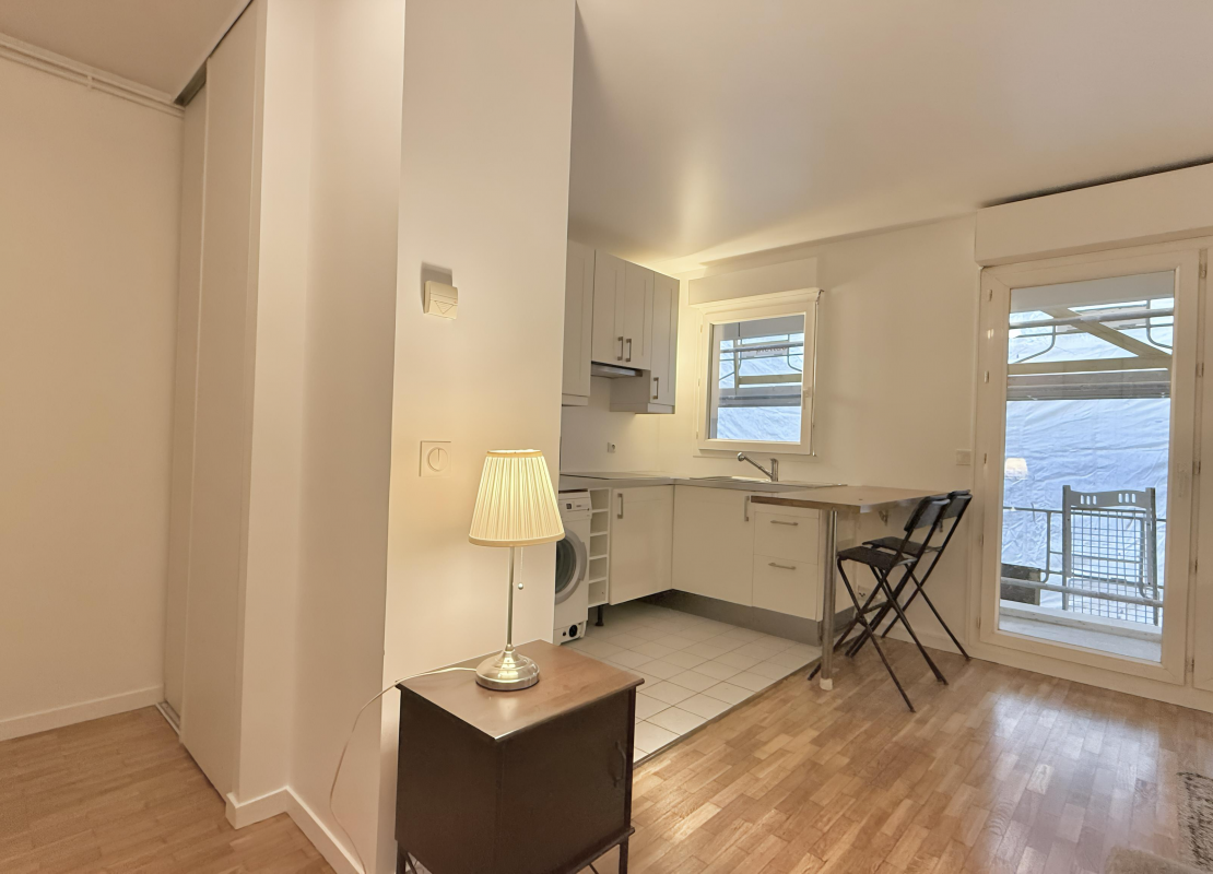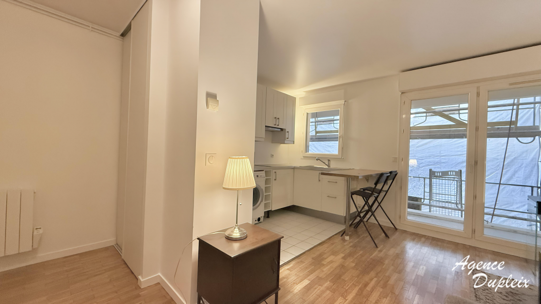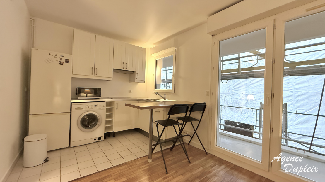 Un studio entièrement repeint au 1er étage sur cour d'un immeuble récent avec ascenseur se composant d'une entrée avec placards, une pièce principale avec un grand balcon donnant sur cour, une cuisine américaine aménagée et équipée d'une machine à laver, d'un frigo congélateur, d'une hotte, de plaques vitro-céramique, une salle de douche avec WC. Une cave complète se bien