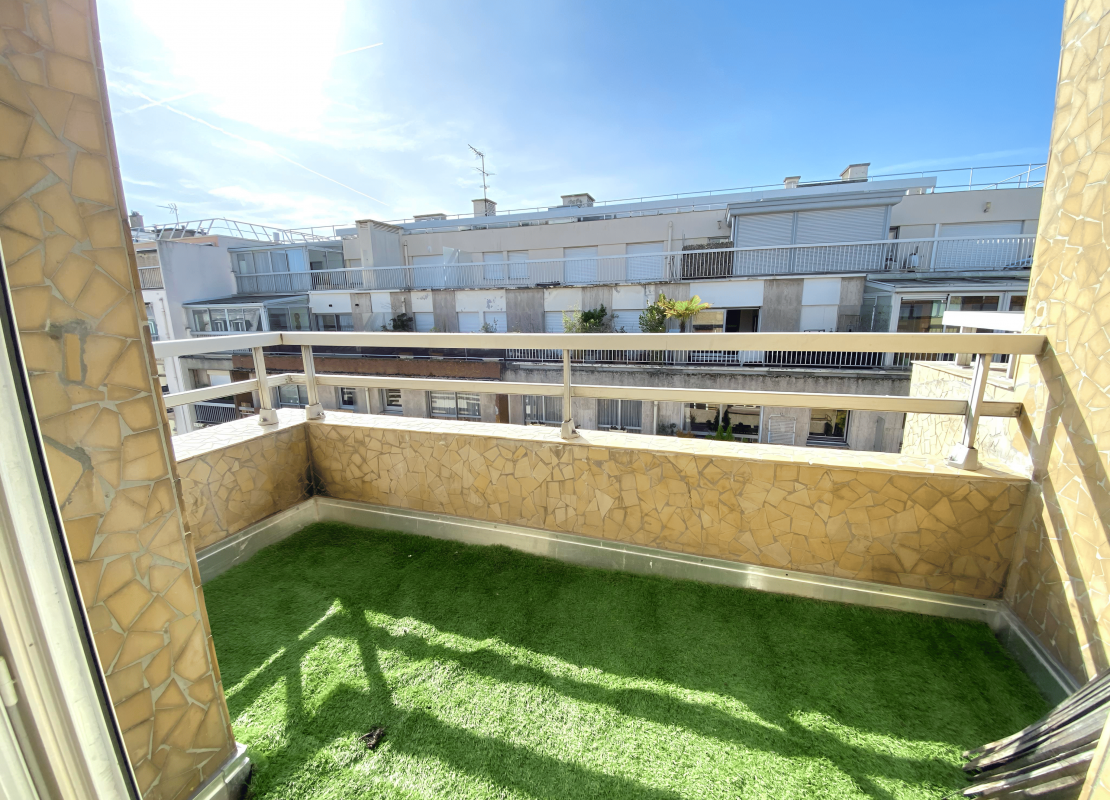 Un appartement de type 2 pièces au 6ème et dernier étage avec ascenceur comprenant une entrée avec rangements, un double séjour avec 2 balcons, une cuisine aménagée de placards et équipée de plaques de cuisson, d'une hotte, d'un réfrigérateur- congélateur, d'un lave vaisselle et d'un four, une chambre avec rangements et un balcon, une salle de bains avec WC.